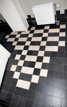 Destijds werden de vloerdelen met donkerbruine of zwarte waterbeits bewerkt en vervolgens in de was gezet en uitgewreven. Een vloerkleed of tapijt zorgde dan voor een ‘warme’ bekleding, zowel in de letterlijke zin als in de figuurlijke zin van sfeerbepaling. Kamerbreed tapijt bestond nog niet. De beits werd niet op de gehele vloer aangebracht, maar slechts op de plekken waar het kleed of tapijt niet toereikend was.